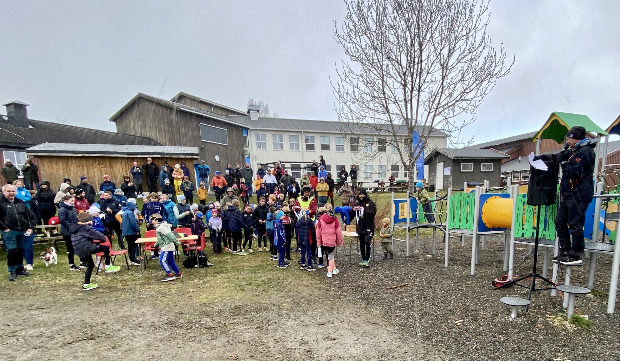- Det var litt hustrig vær under årets Ogndalsstafett, men stemningen var god, ikke minst da Ola Westerhus og Stein Morten Jensen delte ut jubileumsmedaljer til alle. Speaker og leder i friidrettsgruppa, Torbjørn Wekre til høyre.